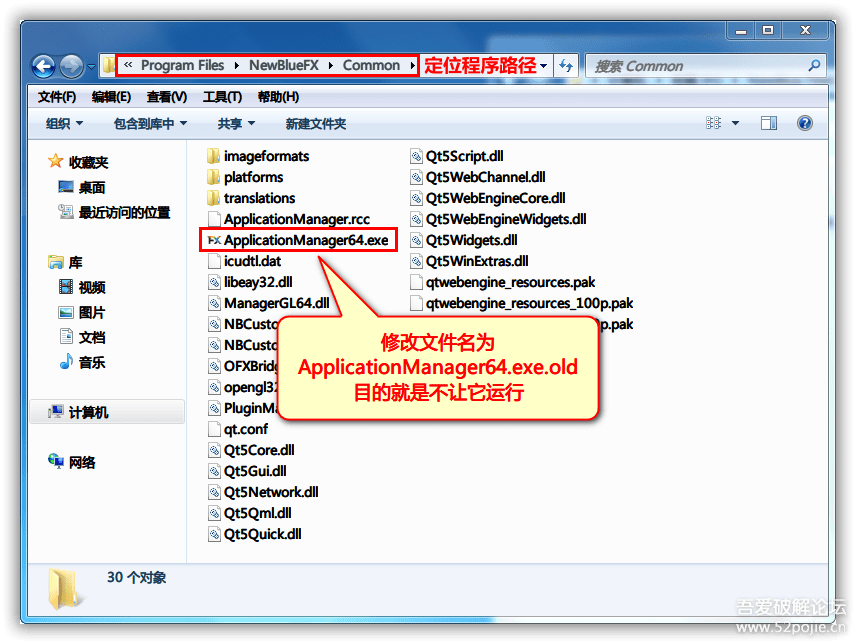 1、定位到程序目录【C:\Program Files\NewBlueFX\Common】修改【ApplicationManager64.exe】为【ApplicationManager64.exe.old】,其目的就是不让它运行。